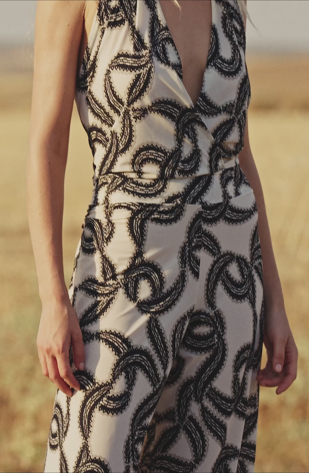 Dans un jeu de contraste et de fronces, le pantalon ample de la combinaison CALIN s’associe à un haut, effet cache-cœur, ajusté et profondément décolleté. Pour sublimer la féminité, elle offre un dos nu au détail raffiné : un ajour autour duquel se drape le tissu pour une allure sophistiquée. L’imprimé Ballerina, une danse vibrante et géométrique, sur des tonalités noires et écrues.